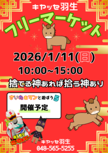 お知らせ 2025.12.23 2026年1月 フリーマーケットのお知らせ 2026年1月11日にフリーマーケットを開催します(‘ω’)ノ さいたぁマンも来園予定です✨ 【野外・室内】両方で開催予定なので暖かい服装でご来園下さい(*’▽’)