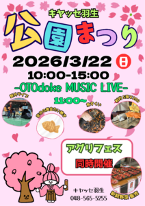 お知らせ 2026.03.20 公園まつりのおしらせ 3月22日は【公園まつり】です(‘ω’)ノ 是非、遊びに来てください٩( ”ω” )و #キヤッセ羽生 #羽生市 #公園まつり #otodokemusiclive #黄金たい焼き