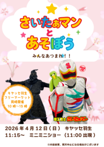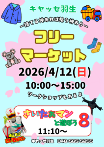 お知らせ 2026.03.29 フリーマーケットのおしらせ 2026/4/12(日) 10:00~15:00 【フリーマーケット】 【さいたぁマンと遊ぼう】 を同時開催します(・ω・)ノ ワークショップもあるので是非遊びに来て下さい✨ まだまだ出店者募集してます。 詳しくはお電話下さい📞(´∀`*) キヤッセ羽生 048-565-5255 #キヤッセ羽生 #羽生市 #埼玉 #フリマ #さいたぁマン #ご当地ヒーロー #ワークショップ